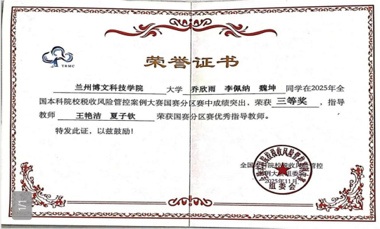 近日,备受瞩目的2025年全国本科院校税收风险管控案例大赛甘肃省分赛圆满落下帷幕。我院由王艳洁、夏子钦老师指导的学生团队凭借扎实的专业功底与创新的风险管控方案,从众多参赛队伍中脱颖而出,成功斩获省级三等奖,为学院赢得了荣誉。