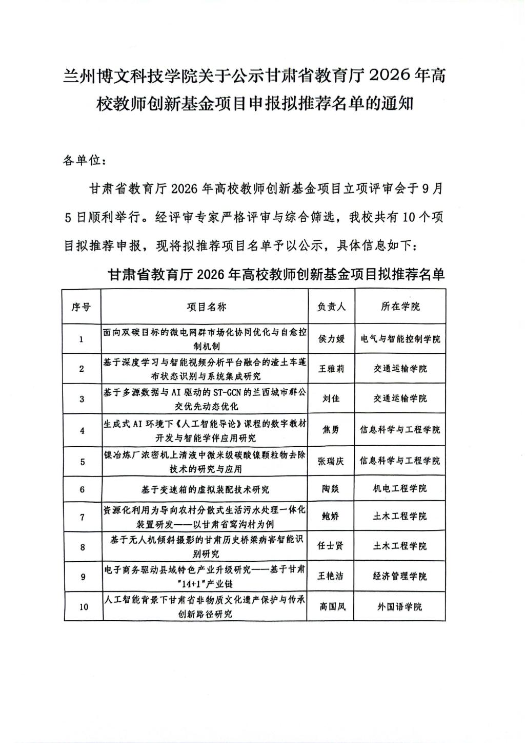 bat365在线中国登录入口关于公示甘肃省教育厅2026年高校教师创新基金项目申报拟推荐名单的通知