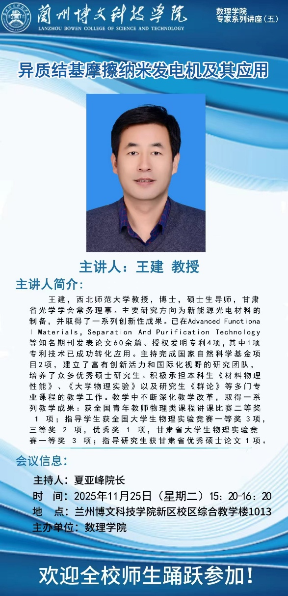 王建教授为西北师范大学教授、博士、硕士生导师,甘肃省光学学会常务理事,长期致力于新能源光电材料制备研究,在国际知名期刊发表论文60余篇,授权发明专利4项,教学与科研成果双优。他围绕异质结基摩擦纳米发电机及其应用展开分享,从材料制备、工作原理到实际应用场景,系统介绍了摩擦纳米发电机的前沿研究成果,结合具体案例讲解了新能源光电材料在实际生产生活中的应用前景,让师生近距离接触新能源材料领域的前沿技术。