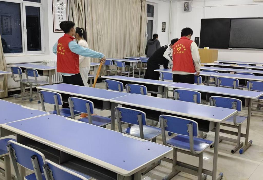 “洁净教室·共筑文明”主题卫生清扫工作活动正式开始后,各教室内呈现出热火朝天的劳动场景。活动现场,身穿统一马甲的志愿者按分工进行卫生清扫工作,针对桌椅残留痕迹、地面缝隙杂物、黑板污渍等问题采取针对性清理措施。部分学生主动承担窗台、角落等难清理区域作业,展现出土木工程学院团委成员不怕脏、不怕累的实干精神。