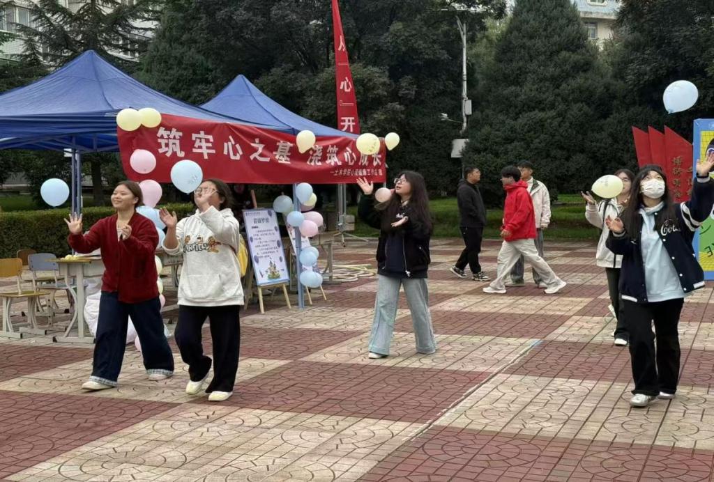 活动当天,土木工程学院成员早早抵达活动现场,开启前期筹备工作。现场分工明确、协作高效,有的搭建蓝色帐篷,确保活动摊位稳固;有的吹起缤纷气球,将现场装点得活力满满;有的摆放游戏道具、张贴主题海报,将活动核心标语“筑牢心之基,浇筑心成长”清晰呈现。