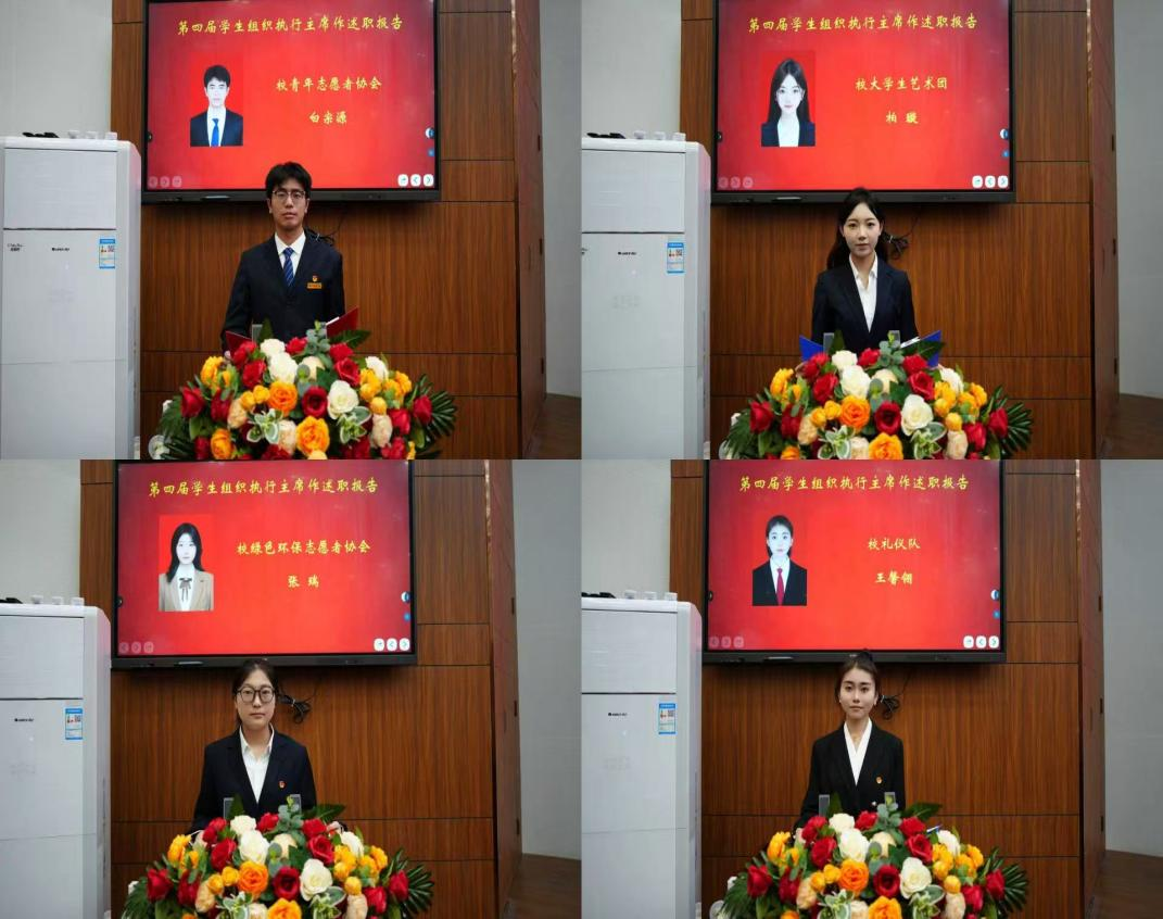 紧接着,学校学生组织第四届主席团成员代表依次登台述职。他们围绕活动策划、团队建设、服务同学等核心工作,全面回顾了过去一年的奋斗历程,既分享了团队凝聚力提升的丰硕成果,又坦诚剖析了工作中的问题与不足,字里行间满含对学生工作的热爱与不舍,以及对学弟学妹的殷切期许,真挚发言赢得现场阵阵掌声。