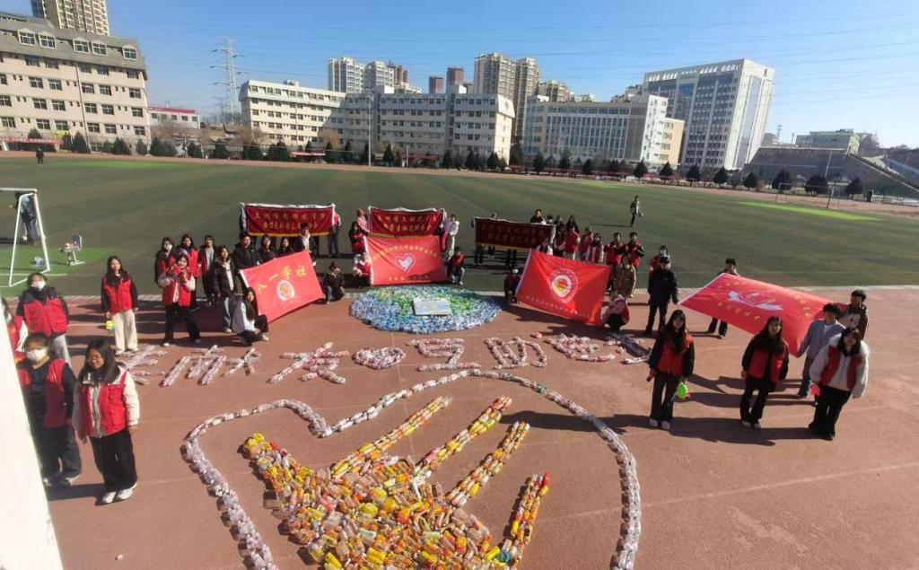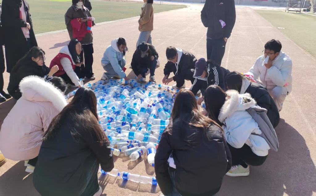 在“海韵赠记站”,同学们分组协作,将回收的塑料瓶清洗干净后,开始摆起了今日活动主题的图案。有的小组用蓝色和绿塑料瓶拼成了“地球”的画面,有的则用黄色和白色塑料瓶,摆出了“手掌”的造型。志愿者们在一旁协助大家固定瓶子,并不时讲解海洋塑料污染的危害,让同学们在创作中深化环保认知。经过一个小时的努力,生动的图案在操场上呈现,引来不少师生驻足拍照。