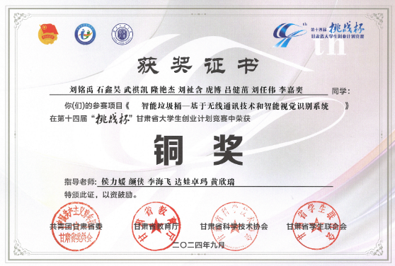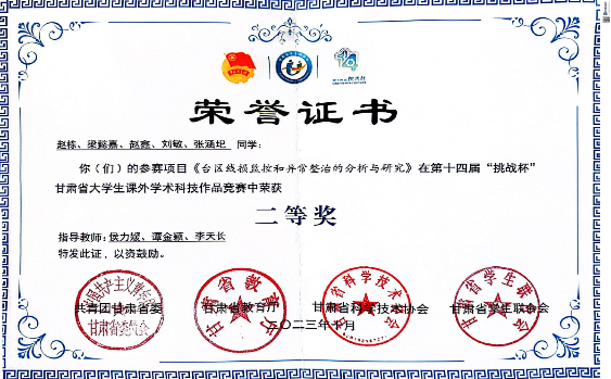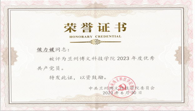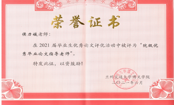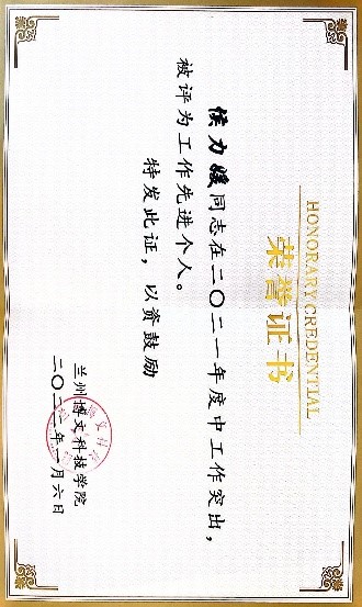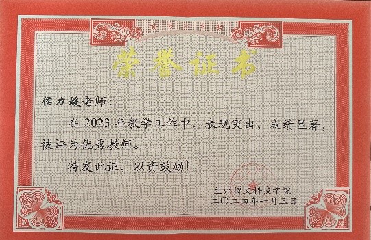 所获奖励有“第十四届“挑战杯”甘肃省大学生创业计划竞赛”荣获铜奖2项、“2023年度优秀共产党员”、“2023年度优秀教师”、“2023年全国大学生创新创业能力大赛-决赛产品创新组二等奖”、“第十四届“挑战杯”甘肃省大学生课外学术科技作品竞赛-自然科学类学术论文-二等奖”、“2021年度荣获工作先进个人”、“2021届优秀毕业论文指导老师”、“2019-2020年度优秀班主任”、“首届课程思政教学竞赛三等奖”、“2019-2020学年优秀党务工作者”、“2019年讲稿评选活动优秀奖”、“2019年全国大学生电子设计竞赛甘肃赛区二等奖”、““守纪律、讲规矩”专题演讲比赛三等奖”、“2016年辅导员职业能力大赛三等奖”、“2015年青年教师讲课比赛优秀奖”。