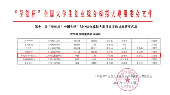 2025年6月28日,由甘肃省教育厅主办、兰州财经大学(和平校区)承办的第十二届“学创杯”全国大学生创业综合模拟大赛甘肃省选拔赛圆满落幕。本次大赛吸引了全省多所高校学子积极参与,在数字营销模拟赛项本科组中,我院学生团队凭借出色的表现和扎实的专业技能,荣获省级三等奖。