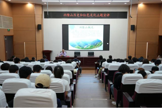 宣讲环节,黄伟主任化身文化信使,以深厚的学养和生动的语言,引领师生神游兴隆山。他细数独特的地质构造与珍稀物种,揭示自然资源的生态密码;如数家珍般盘点著名景点,将层峦叠嶂、溪涧幽深的画卷铺陈眼前。黄主任着重介绍了兴隆山作为红色旅游重要承载地的光荣历史,张一悟等革命先辈在此战斗的足迹,让红色基因在讲述中焕发时代光芒。他还生动勾勒了历史上栖身此山的道教名人风采,使传统智慧穿越时空,叩击心灵。整场讲解图文并茂,互动频频,现场师生沉浸其中,兴隆山的自然之壮美与人文之厚重深深烙印于心。