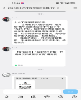 为深入贯彻落实反邪教警示教育工作要求,切实提升全校学生识邪、辨邪、拒邪能力,筑牢校园思想安全防线,10月23日下午15:20,土木工程学院严格按照上级部署,组织全体学生通过视听甘肃 APP陇原剑平台、甘肃卫视视频号/微博及《法治伴你行》视频号等指定网络直播渠道,集中观看甘肃省反邪教警示宣传“进高校”集中展演活动(第一站・兰州交通大学礼堂)。活动后台实时统计观看数据,土木工程学班主任、团学会同步强化督促引导,确保学生全程认真参与、学有所获,杜绝敷衍观看现象。
