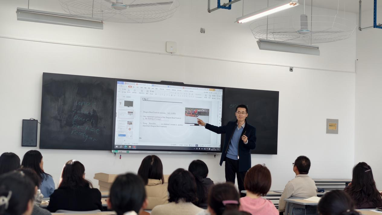 活动在热烈的掌声中拉开帷幕。徐洋老师以其在省赛中荣获特等奖的课程《Unit 4 Festivals》为蓝本,围绕“端午节”这一文化主题,呈现了一堂精彩纷呈的视听说示范课。课程巧妙运用多媒体技术与AI工具,通过精心剪辑的视频片段、智能语音互动等形式,营造出沉浸式的语言学习环境。徐老师深度融合CLIL(内容与语言整合教学法)与T-PACK(技术教学内容知识)框架,将语言技能训练、文化知识传授与思政育人目标有机统一,充分展现了“技术赋能教育、教育回归育人”的现代教学理念。