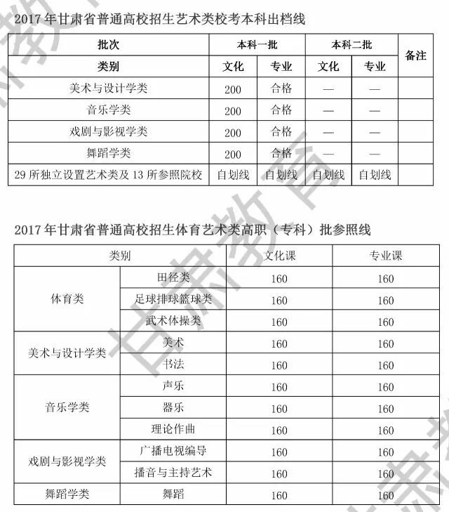 2017年甘肃省普通高校招生体育艺术类统考分数线已划定,现公布如下: